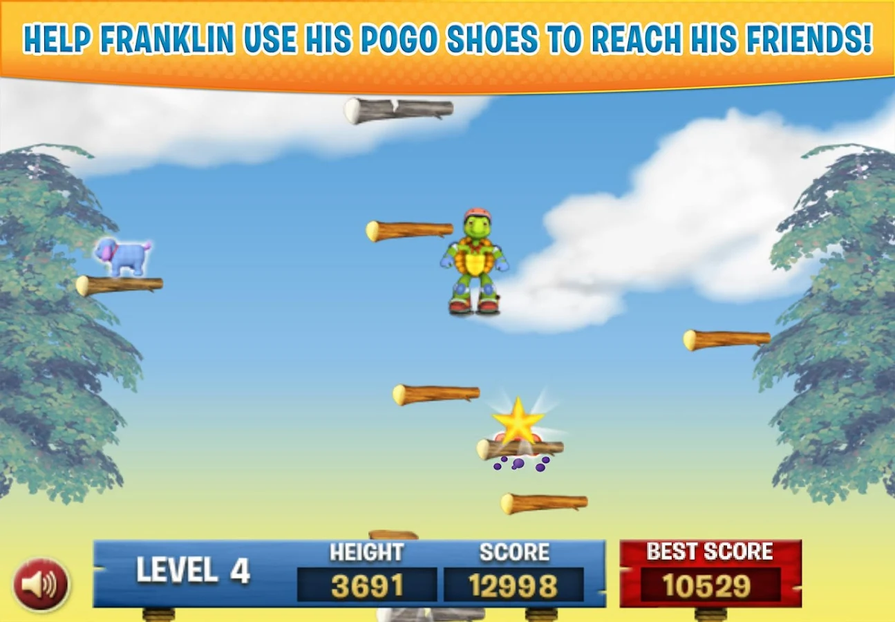 Join Franklin the Turtle and his friends in the first Franklin game for Android! Franklin has new pogo shoes, and wants YOU to help him reach his friends way up in the treehouse! Bounce, bubble and burst your way up the tallest tree to visit all of Franklin’s favorite friends - Bear, Fox, Snail and more! Just keep an eye out for falling fruit, broken branches, and angry birds. Set your sights high with Franklin’s Pogo Paws!